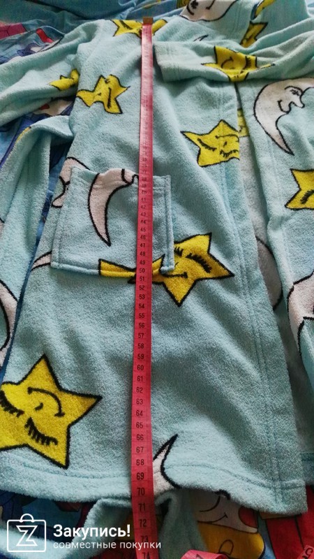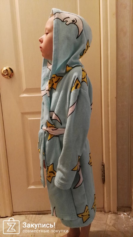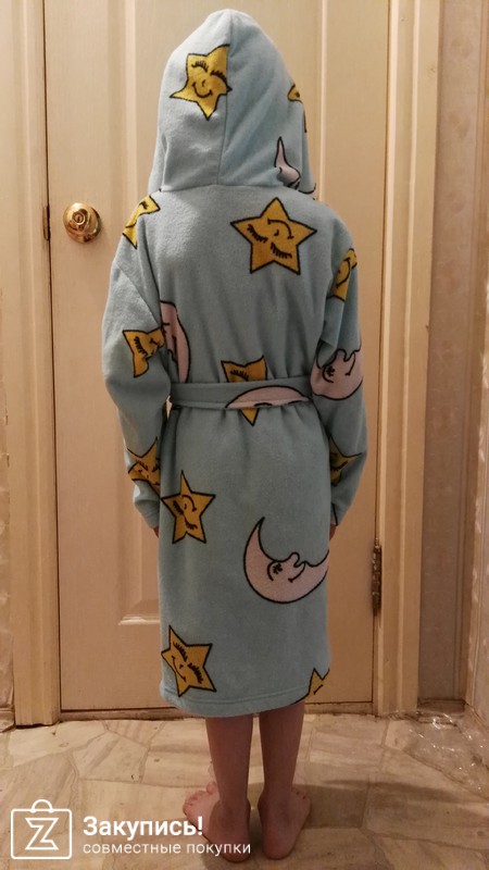 Халат на рост 112 см брала размер 7. На халате 1 карман, пояс пришит сбоку, так что не потеряется.Халат очень мягкий и приятный, есть капюшон. Длина рукава от плеча 40 см, дина халата от плеча 70 см. Ребенку халат ниже колена, рукава длинные я их подгибаю.