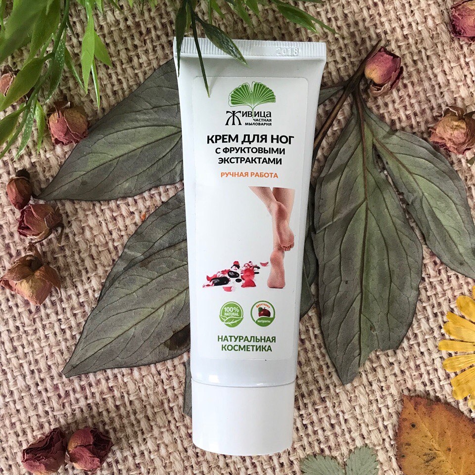 Крем для ухода за кожей ног Живица содержит фруктовые экстракты и кислоты, которые отшелушивают омертвевшие клетки и ускоряют обновление кожи стоп.