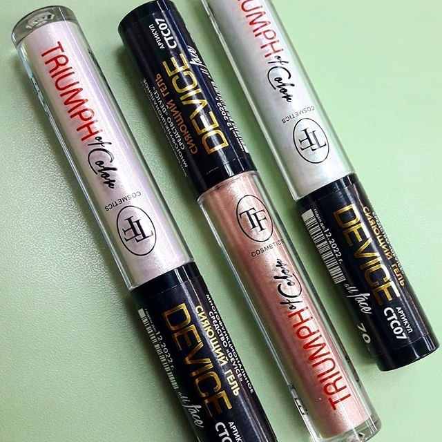 Device Многофункциональный сияющий гель Многофункциональный гель для создания ультрамодного макияжа, замена как минимум пяти продуктов в вашей косметичке: тени, лайнер, фиксатор теней, хайлайтер, блеск для губ. В палитре три оттенка для любого мейкапа: от нежно романтического до праздничного. Невесомая гелевая текстура мгновенно сохнет и великолепно фиксируется.