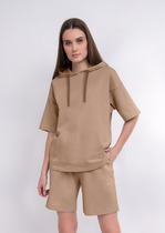 Объемный джемпер из футера с капюшоном. Спущенная линия плеча. Рукав до локтя. На детали переда карман-кенгуру.