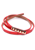 Узкий ремень из лакированной кожи с металлическими деталями. Застёжка на пряжку.