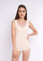 Майка классической длины на широких бретелях, декорирована кружевом по переду.