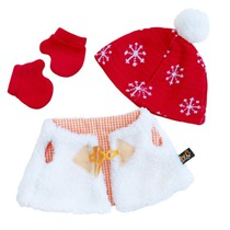 Уютный зимний комплект для кота Басика — красная шапочка из вязаного трикотажа с помпоном, белоснежный меховой жилет и красные варежки.