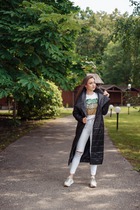Силуэт прямой, зауженный книзу. Капюшон одношовный. Карманы в боковом шве. Пояса нет. Длина рукава 72 см. Длина изделия по спинке 78 см.