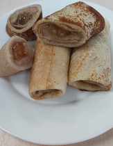 Блины Жюльен - в составе куриный фарш, грибы, сыр и соус