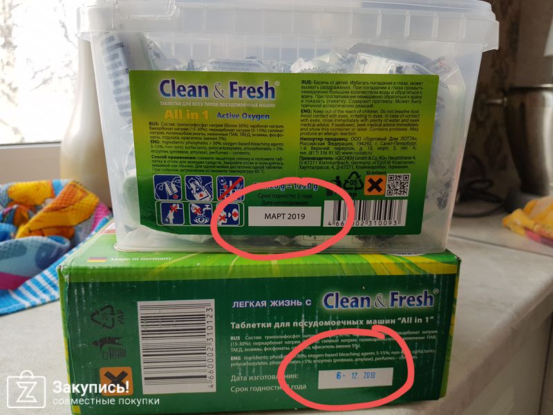 Больше года пользовалась таблетками Clean&Fresh, без нареканий. Делила таблетку пополам и все отмывало хорошо. Беру всегда таблетки про запас, как вижу акцию, поэтому у меня есть в запасе 2-3 пачки. В этот раз получилось, что открыла следующей пачку из последнего выкупа. Сразу бросилось в глаза, что таблетки другого цвета, они не плотные, крошатся, поломанных много в упаковке. Посуда стала отмываться очень плохо. На стеклянных тарелках и салатниках, ложках постоянно разводы и белый налет. Не промывает, как-будто таблетку забыли положить. Перестала делить, стала по целой закладывать. Результат не улучшился. ППМ не старая, ей всего 1,5 года -стали разбирать, все промывать. Без толку. Достала другую пачку таблеток, из более раннего закупа. Отмыло отлично!!! Вывод -производитель стал производить некачественный товар! Фото в сравнении товара из партии март 2019 и декабрь 2019.