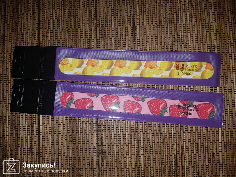 2. С клубничкой абразив 120 на 240. Делает четкий спил у натуральных ногтей, а вторая сторона очень мягкая, подходит для полировки.