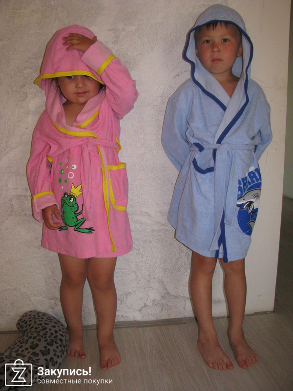 Заказывала халатик. Тонкая махра, без синтетики, удобный капюшон - для бассейна, бани отлично подходит. Качество пошива и ткани хорошее, за такие деньги даже не ожидала. Стираю раз в неделю после бассейна, не линяет, не теряет цвет. На рост 106 взяла 122-128, ниже колена, как и хотела, и запахнуться можно нормально (у меня мальчик широкоплечий).