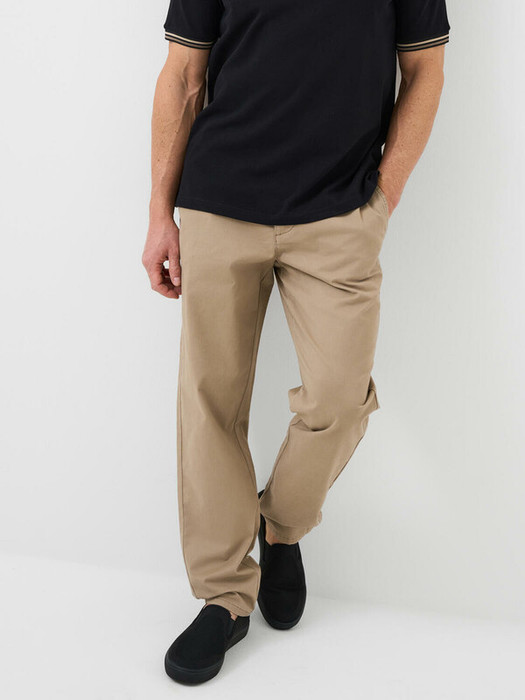 Мужские классические брюки. Выполнены из плотного хлопкового твилла. Модель прямого кроя со средней посадкой и длиной до щиколотки. Пояс оснащён эластичными вставками по бокам и шлевками под ремень. Спереди — карманы с входом, сзади — два кармана, которые застёгиваются на пуговицы. Основная застёжка — на молнии и пуговице.