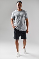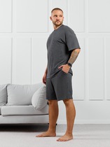 Мужские джинсовые шорты длиной чуть ниже колена. У шорт классическая посадка на талии, пояс с пятью шлёвками и застёжка на молнию и болт. Спереди — два классических кармана и маленький карман для мелочей, сзади — два накладных кармана. Также по бокам расположены объёмные карманы-карго. На поясе сзади пришита кожаная джинсовая нашивка с логотипом.