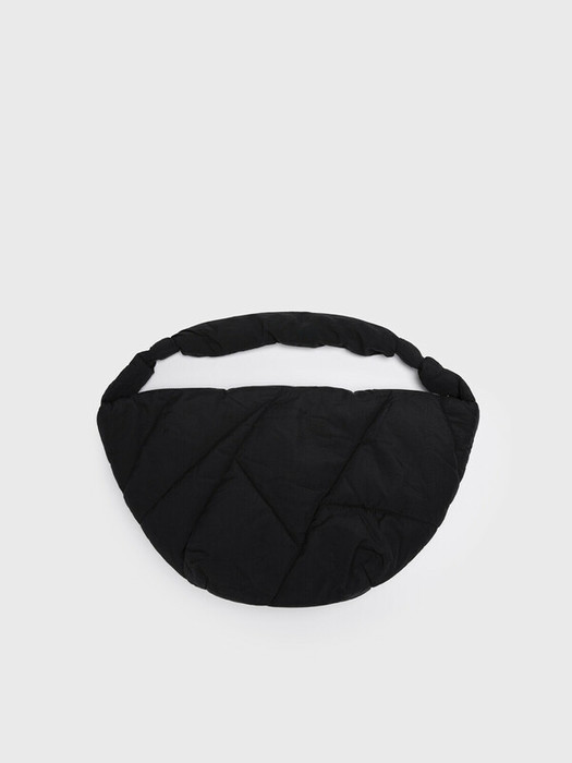 Трендовая женская дутая сумка с оригинальной простежкой. Форма полумесяц. Яркая подкладка является акцентной деталью этой модели. Сумку можно носить как на плече, так и как кросс-боди. Сумка закрывается на молнию. Внутри есть карман на молнии для документов. Параметры: высота - 28 см, ширина - 56 см, глубина - 15 см.