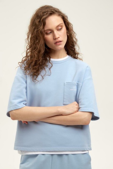 Футболка из мягкого двухцветного футера. Внутренняя сторона изделия представлена в натуральном цвете хлопка, внешняя в нежно-голубом. За счет использования крашенной пряжи, данный вид полотна прошел минимальную обработку, что придало изделию мягкость и шелковистость.
