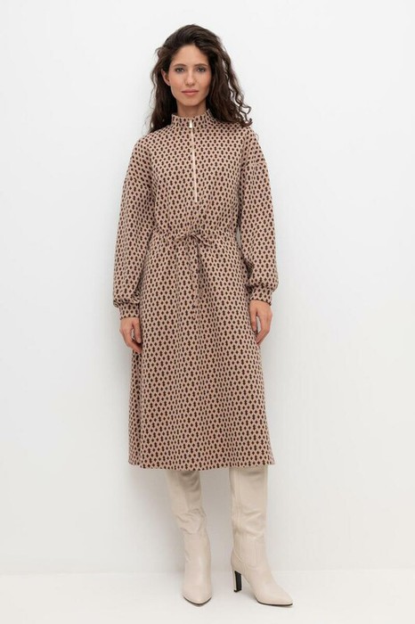 Платье с кулиской из плотного гладкого трикотажа интерлок с застежкой на молнию. Кулиска по линии талии подчеркивает женственность пропорций. Шнурок с наконечниками для утяжки служит украшением. Спущенное плечо придает изделию свободный силуэт.