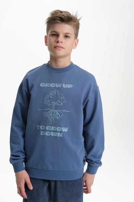 Свитшот без начеса из материала футер-петля. Манжеты и низ изделия из рибаны. Толстовка весенняя украшена выпуклым резиновым принтом, а также надписью. Перевод надписи: "grow down to grow up" - расти вниз (в смысле "пустить корни"), чтобы вырасти вверх. В составе ткани преобладает высококачественый хлопок — спортивная кофта приятна на ощупь и прекрасно пропускает воздух. Тонкую кофту можно носить круглый год. Широкая размерная сетка подойдет как для малыша так и для подростка.