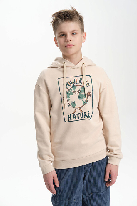 Худи для мальчика без начеса – актуальная вещь в любом сезоне, будь то весна, лето или осень. Кофта спортивная для мальчика выполнена из плотного футера-петля, который отлично согревает в прохладную погоду и при этом хорошо пропускает воздух – ребенок активно двигается, играет, не потеет. Толстовка свободного покроя оверсайз со спущенным плечом, углубленной проймой. Рукава а также низ изделия на манжете из рибаны. Кофта без карманов. Капюшон на запахе со шнурками для регулировки. Пайта для мальчика украшена по переду выпуклым резиновым принтом, а также надписью. Перевод принта "power to nature" - власть природе. Размерный ряд подходит как для малышей так и для подростков.