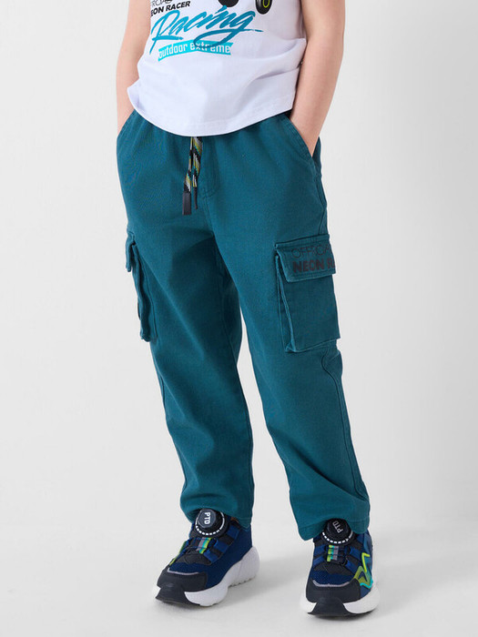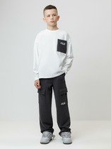 Детские брюки для мальчика. Модель свободного силуэта, выполнена из хлопкового текстиля твилл. Пояс на резинке, дополнен шнуром для регулировки объема. Спереди — два удобных боковых кармана и два накладных кармана. Один из них украшен яркой жаккардовой нашивкой, а второй — принтом.