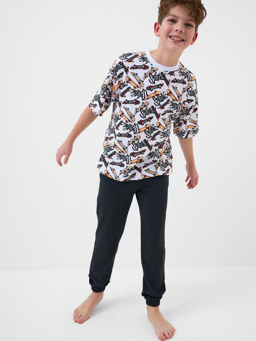Пижама для мальчика подростка. Комплект состоит из футболки оверсайз с короткими рукавами и длинных брюк. Материал - хлопковый трикотаж. Футболка выполнена на белом фоне с ярким и стильным принтом. Брюки — черные, с темным камуфляжным принтом, дополнены удобным поясом на резинке и контрастным оранжевым шнуром. В боковых швах — карманы. Низ брюк собран на резинку, что удобно и практично.