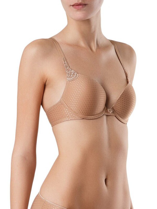 Бюстгальтер серии VOYAGE отличается чистотой линий и исключительным комфортом. Выполненный из полотна с деликатным жаккардовым рисунком «в горошек» и украшенный аппликациями макраме, бюстгальтер поможет создать одновременно простой и утонченный образ. Преимущества модели:- формованная чашка push-up, на каркасах;- вышитые аппликации макраме. - абсолютный комфорт на протяжении всего дня.