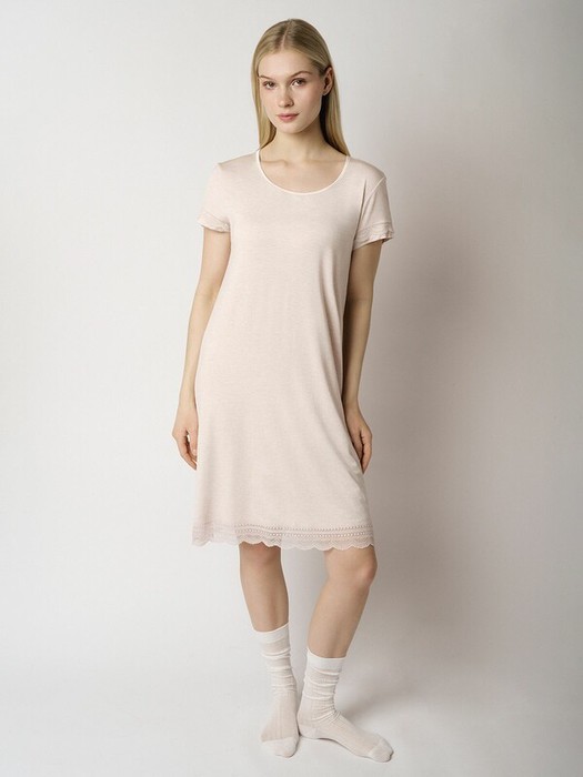 Сорочка, выполненная из мягкого модала с меланжевой фактурой ткани. Дополнена романтичной атласной отделкой и кружевом. Длина чуть выше колена.