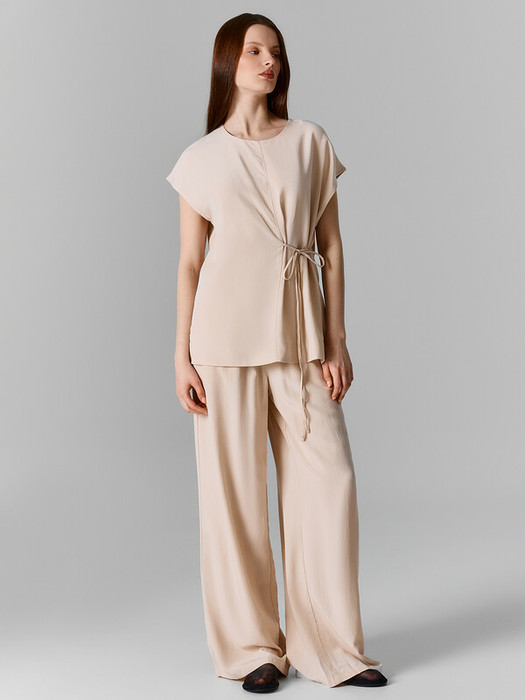 Брюки прямые свободные, посадка средняя. Пояс цельнокроеный с эластичной тесьмой внутри (20мм 20RV). С внутренней стороны пояса пробиты петли и втянут шнур-бейка из основного полотна. На деталях переда обработаны карманы-хулиганы. Подкладка карман из основного полотна. На правой детали переда имитация гульфика. Нижние срезы обработаны швом вподгибку с закрытым срезом.