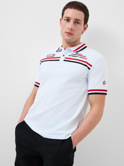 Мужская футболка-поло. Модель с короткими рукавами, выполненная в спортивном стиле. Поло прямого кроя, средней длины, с воротником и манжетами из плотной рифлёной ткани в полоску. Спереди нанесены графика и надписи в гоночной тематике, включая логотипы и слоганы. На планке — три пуговицы. По бокам предусмотрены небольшие разрезы. Материал - хлопковый трикотаж пике.