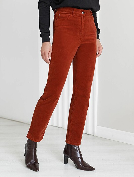 Брюки выполнены из мягкого хлопкового микро-вельвета с добавлением эластана. Изделие комфортно садится по фигуре и не сковывает движения. Модель с пятью карманами, как у джинсов-скинни дополнена высококачественной фурнитурой с фирменным логотипом бренда. Хорошо комбинируется с вязаным трикотажем, блузками и денимом. Как альтернатива брюкам, в нестрогий офисный дресс-код.