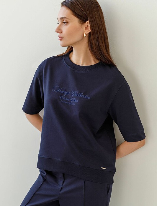 Футболка темно-синего цвета свободного кроя выполнена из премиального футера двухнитки с эластаном плотностью 240 Г/м2. . Натуральный материал отличается мягкостью и приятной текстурой, позволяя коже дышать и обеспечивая максимальное удобство при носке.  Наличие эластана в составе изделия гарантирует абсолютный комфорт и формоустойчивость. Круглый ворот, рукава средней длины и спущенная линия плеча придают футболке стильный и современный вид, делают образ расслабленным и непринужденным, такой вариант отлично сядет на большие размеры. Футболку украшает принт виде надписи. Перевод надписи: Vintage collection - Витнажная коллекция. Плотная футболка идеально подходит для повседневной носки и незаменима для тех, кто ценит удобство и свободу движений без компромиссов по стилю.