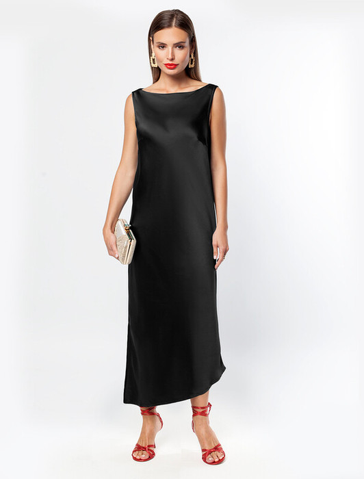Платье с горловиной формы лодочка выполнено из плотного полуматового сатина, напоминающего натуральный шёлк. Лаконичная модель дополнена ассиметричным низом с разрезом, скроенная по косой струится и переливается при каждом шаге. Ткань почти не мнется и имеет легкий вес. Роскошная модель для праздничного мероприятия, хорошо будет сочетаться с жакетом или кожаным верхом.
