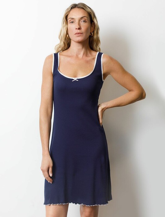 Сарафан темно-синего цвета длины мини с вырезом  из эластичного трикотажа кашкорсе создан для современных женщин, ценящих красоту и удобство. Крой выгодно подчеркивает фигуру и создает женственное настроение в образе. Благодаря отделке нежным кружевом сарафан выглядит по-особенному романтично и изысканно. Трикотаж кашкорсе обеспечивает комфортное ощущение в течение дня как дома, так и на отдыхе. Этот домашний сарафан подойдет для спокойного вечера в кругу семьи, а так же для отдыха и сна. Мягкая ткань трикотажа приятна на ощупь и создает ощущение уюта. Любое движение свободно благодаря эластичному составу, который помогает сохранить форму даже после долгой носки. Легкий аккуратный волан по низу придает платью на широких лямках интересный акцент.