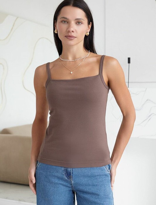 Совместные покупки Курган Женская одежда Майки, топы — 09.04 Vilatte Топ с двуслойной зоной бра на бретелях из хлопка D43.168 т.кофейн