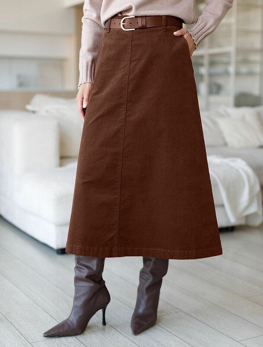 Юбка-миди трапециевидного силуэта выполнена из мягкого хлопкового микро-вельвета с добавлением эластана. Изделие комфортно садится по фигуре и не сковывает движения. Модель дополнена высококачественной фурнитурой с фирменным логотипом бренда. Хорошо комбинируется с вязаным трикотажем, блузками и денимом.Также прекрасно станет альтернативой деловым низам в нестрогом офисном дресс-коде.