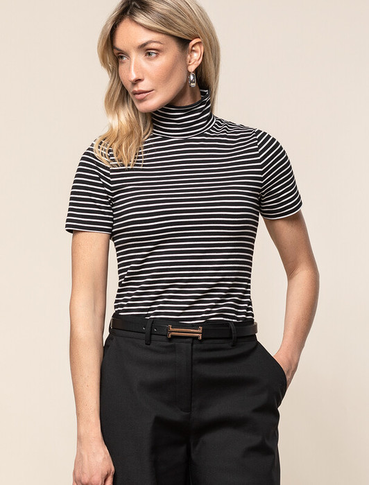 Водолазка с коротким рукавом выполнена из премиального хлопка с добавлением эластана. Гладкий трикотаж обеспечит гарантированный комфорт и удобство в использовании. Внизу изделия металлическая нашивка с логотипом бренда. Совет стилиста: водолазка может заменить рубашку в нестрогом офисном образе или подружиться с джинсами-трубами, жилетом и кедами в расслабленном повседневном наряде.