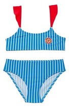 Сплошной купальник с ярким принтом. Узкие бретели отделаны оборкой. Впереди на подкладе.