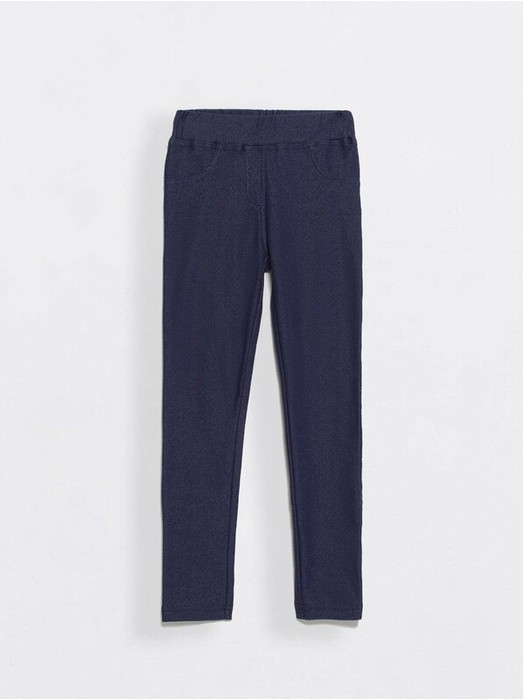 Леггинсы для девочки облегающие из триктажного полотна "джинс" . По переду изделия-имитация гульфика и боковых карманов. По спинке-кокетки и накладные карманы с вышивкой. Верх изделия обработан широким поясом с широкой резинкой внутри.