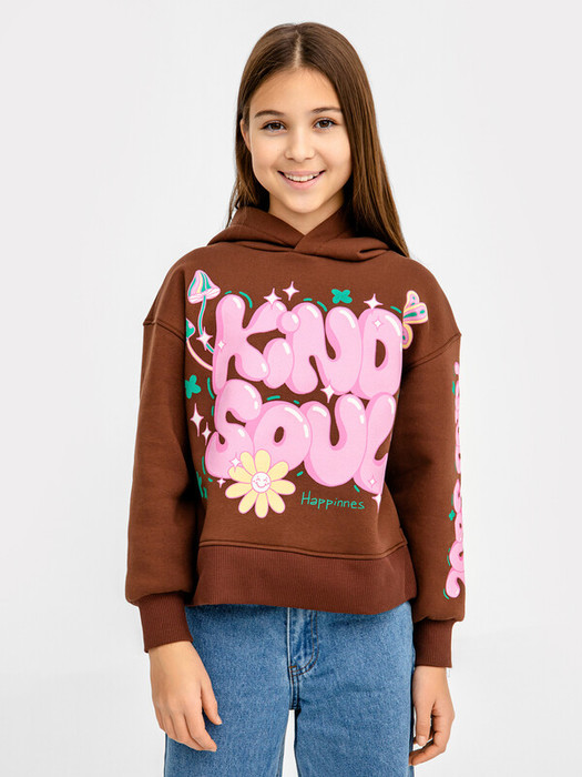 Комфортное расслабленное худи для девочек. Выполнено из легкого трикотажного футера. Прямой силуэт, длинные рукава на широких манжетах, уютный капюшон – ничего лишнего. Особый комфорт дарит спущенная линия плеча. Девочке наверняка понравится оформление этого худи.