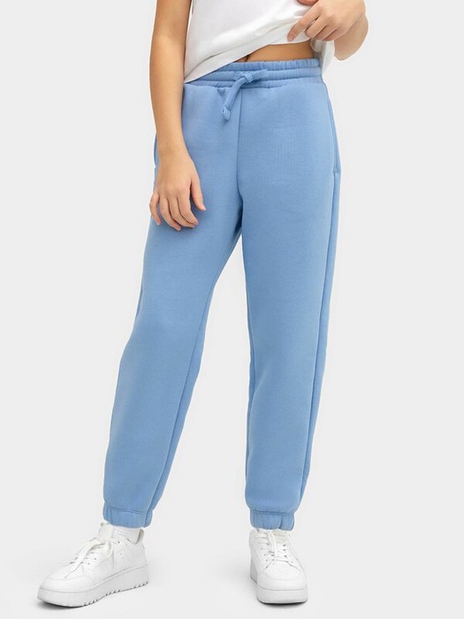 Брюки изготовлены из трикотажного полотна футер. Брюки свободного силуэта. Сиденье немного спущено. В боковых швах обработаны карманы. Подкладка карманов из кулирки. Пояс отрезной с эластичной тесьмой внутри. В передней части с лицевой стороны пробиты петли и втянут шнур.