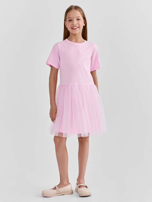 Платье для девочек свободного силуэта с отрезной юбкой.  Горловина округлой формы обработана обтачкой  из рибаны. Рукава втачные, корткие. Юбка трехслойная на сборке. Верхние два слоя из полотна трикотажного сетки, подкладка из полотна трикотажного кулирного.