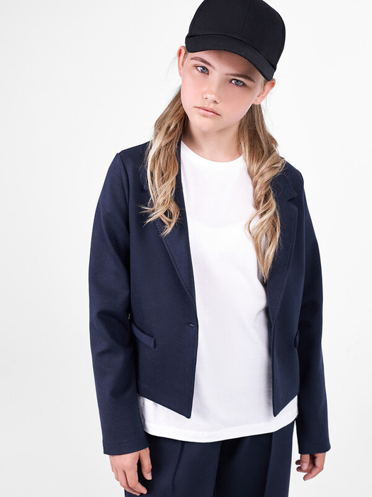Жакет для девочек прямого силуэта, укороченный. Треугольный вырез горловины, отложной воротник с лацканами. Жакет с длинными рукавами. Спереди прорезные карманы в рамку. Без подкладки. Застежка на одну пуговицу. Низ рукавов и жакета обработан швом в подгибку.