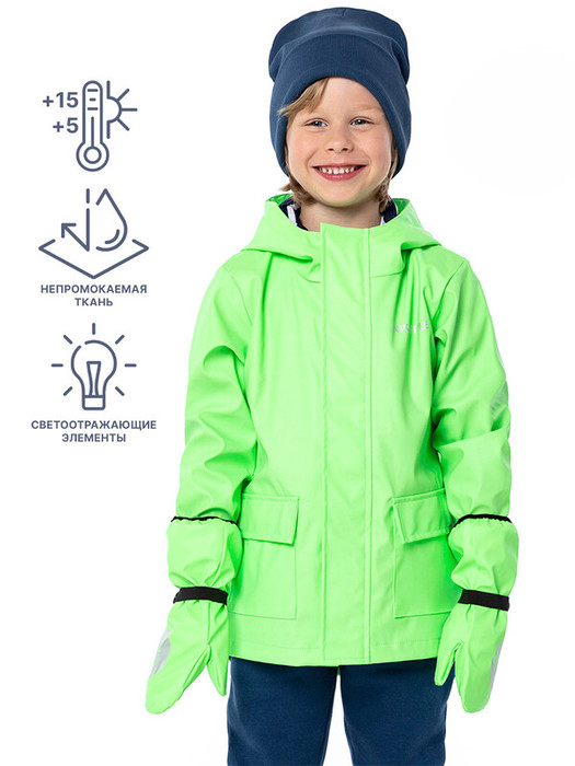 Непромокаемая ветровка NO RAIN с проклеенными водонепроницаемыми швами для защиты ребенка от влаги. На трикотажной подкладке. Прорезиненный материал ткани на хлопковой основе обладает эластичностью, упругостью и прочностью, его смесь с хлопком придает большую мягкость ткани. Водонепроницаемый, легкий, прочный материал, обеспечивает сухость, чистоту и комфорт для ребенка. Незаменимая вещь для практичных родителей и их непоседливых малышей. Центральная застежка на молнию и планку на кнопках. Ветровка в двумя накладными карманами на кнопках. Наличие светоотражающих элементов для безопасности ребенка в темное время суток. Комфортная температура эксплуатации от +10 до +20 С.