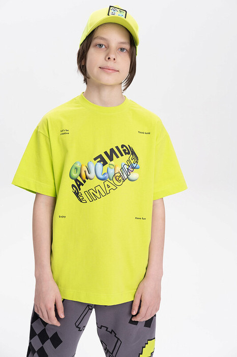Футболка для мальчика свободного кроя - это идеальный выбор для активного ребенка. Вырез горловины обработан эластичной тканью — она прекрасно держит форму, не растягивается, при этом ребёнку удобно надевать и снимать футболку. Изделие неприхотливо в уходе. Футболка летняя с принтом и надписями в стиле Digital. Перевод надписей: "let's be creative" - будь креативный, "think bold" - думай смелее, "enjoy" - наслаждайся, "have fun" - веселись.Яркая спортивная футболка подходит как для подростков так и для малышей в детский сад. Подходит для любого времени года.