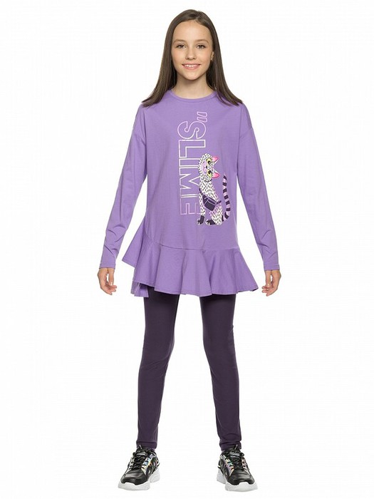 Комплект для девочек туника и лосины. Туника А силуэта с мягким спущенным плечом очень свободного силуэта. Асимметричный низ туники подчеркнут красивым воланом. Фольгированный голографический принт с неоном. Лосины из эластичного трикотажа.