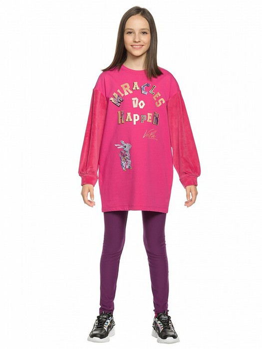 Комплект для девочек туника и лосины. Туника мягкого оверсайз силуэта со спущенной линией плеча. Перед и спинка из футера, рукава из мягкого плюшевого велюра с перламутровым отблеском. Эластичный rubber принт с золотым металликом и глиттером. Надпись Чудеса случаются. Вуаля. Низ Классические лосины из футера с начесом.