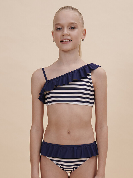 Модный раздельный купальник в полоску для девочки. Топ украшен ассиметричным рюшем. Мягкие бретели не сползают, исключают трение и раздражение. Топ на подкладке, не просвечивает. Классические трусы средней посадки декорированы рюшем по поясу. Передняя часть трусов на подкладке, не просвечивает. Детский купальник выполнен из полиамида и эластана — он прекрасно тянется, не теряя при этом своей формы, не выгорает и быстро сохнет. Купальник в тёмно-синюю горизонтальную полоску — такой узор в стиле тельняшки — один из самых трендовых в этом сезоне. В линейке есть детские купальники следующих размеров: 3 (98); 4-5 (104-110); 6-7 (116-122); 8-9 (128-134); 10-11 (140-146). Купальник красивый подходит для девочек дошкольного, младшего школьного возраста и девочек-подростков. Отличный вариант для летнего отдыха, пляжа, моря и бассейна. Модный купальник — чудесный подарок дочери, внучке или сестре на любой праздник. Выбирайте нужный размер по таблице размеров на фото. Цвет товара на экране вашего устройства может отличаться от цвета изделия вживую. Товар возврату и обмену не подлежит.