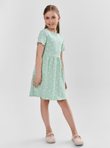 Платье для девочек. Новинка. Платье швейное из хлопка А-образного силуэта с укороченным рукавом. По левой половине изделия вертикальное членение, делящее модель по длине. Вдоль членения настрочена трикотажная декоративная тесьма и рюша из основной ткани. По спинке застежка на одну пуговицу. Декор - вышивка из переливающихся пайеток, перевод Будь первой , и художественным росчерком, перевод Делай это потрясно .