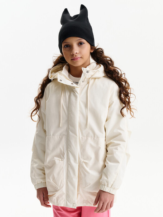 Ширина по низу изделия регулируется внутренним эластичным шнуром со стопперами, что позволяет зафиксировать посадку и предотвращает задувание ветра. Объём по лицевой части капюшона также регулируется шнурком, обеспечивая защиту головы и шеи в ветреную погоду. Центральная застёжка выполнена на молнии.