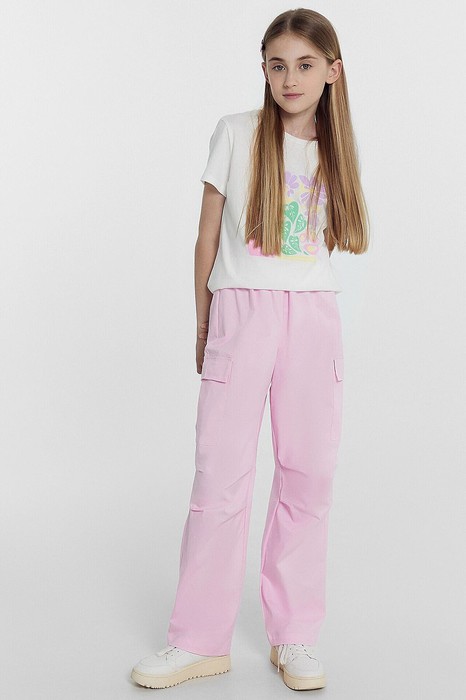 Брюки для девочек осенне-зимнего ассортимента. Брюки карго, посадка высокая. Пояс отрезной с эластичной тесьмой внутри Rv40, образуют сборку. По поясу проложены отделочные строчки. На передних деталях карманы с отрезным бочком. По боковым швам накладные карманы с клапаном. На середине колена, передней детали заутюженные декоративные складки. По низу брюк подгибка с эластичной тесьмой с фиксаторами, образует сборку.