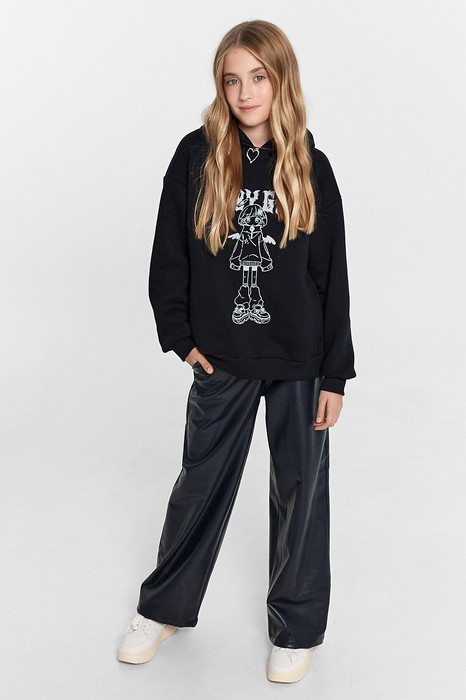 Брюки для девочек свободного силуэта. Средняя посадка, пояс отрезной с эластичной тесьмой Rv50 внутри. Спереди карманы с отрезным бочкок.. Без застежки. Низ обработан швом в подгибку.