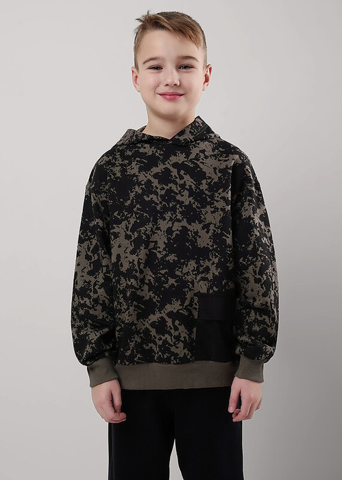 Набивная худи из хлопкового футера для активной жизни ребёнка. Комфортная посадка, манжеты и пояс из кашкорсе. Стильный элемент - накладной карман из плащёвки. Сочетай с любимыми джоггерами и будь в тренде.