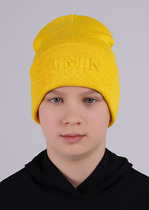 Детская двойная шапка с отворотом, декорирована стильной нашивкой в центральной части и ниточным помпоном. Идеально подойдёт для зимы.