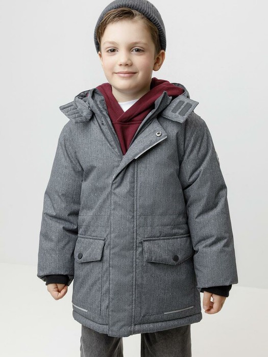 Зимняя куртка для мальчика с утеплителем  SEE®: 300 г/м2. Выполнена из мембранной ткани с дополнительной тефлоновой обработкой, которая предохраняет изделие от загрязнений и отталкивает влагу. Подклад выполнен из 100% полиэстера Tricot. Куртка застёгивается на молнию и внешнюю планку с магнитными кнопками, предусмотрена защита подбородка. Съёмный капюшон на кнопках и липучках имеет эластичную утяжку со стопперами. На рукавах внутренние эластичные манжеты. Два накладных кармана с клапанами по бокам. По талии эластичная утяжка со стопперами. Во всех изделиях верхнего ассортимента для безопасности ребёнка предусмотрены светоотражающие элементы.